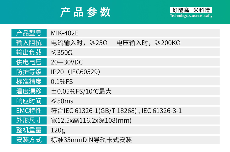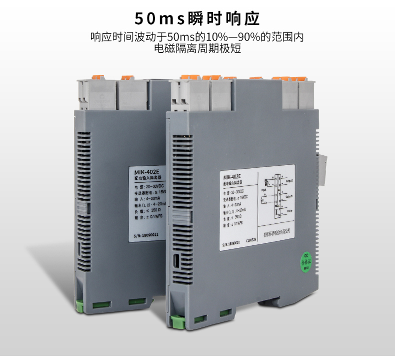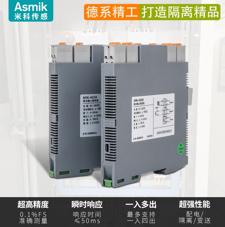 MIK-402E系列信號隔離器,電壓、電流隔離器將直流電壓或電流信號經過隔離傳送,轉換成所需的信號給其他儀表。可以與單元組合儀表及DCS、PLC等系統配套使用,給予現場儀表信號隔離、信號轉換、信號分配、信號處理等,從而提高工業生產過程自動控制系統的抗干擾性能力,保證系統的穩定性與可靠性。本產品品種分為一進一出、一進二出、一進三出、一進四出、二進二出,且輸入、輸出、電源三端隔離。并且大量運用于配電柜和隔離箱等各種工業場合。