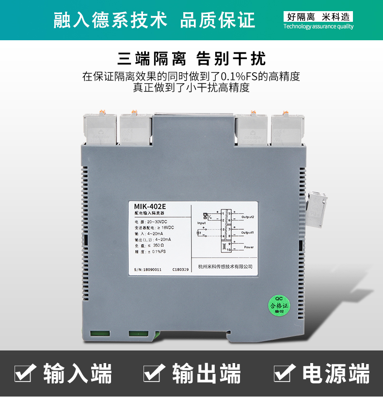 MIK-402E系列信號隔離器,電壓、電流隔離器將直流電壓或電流信號經過隔離傳送,轉換成所需的信號給其他儀表。可以與單元組合儀表及DCS、PLC等系統配套使用,給予現場儀表信號隔離、信號轉換、信號分配、信號處理等,從而提高工業生產過程自動控制系統的抗干擾性能力,保證系統的穩定性與可靠性。